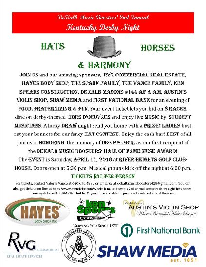 Derby Night Fundraiser – Hats, Horses and Harmony! Doors open at 5:30 p.m.The event will begin at 6:00 p.m. and will feature student performances, simulated horse races, induction of our honoree to the DeKalb Music Boosters Hall of Fame, derby themed hors d’oeuvres, a silent auction, prizes, cash bar and much more!